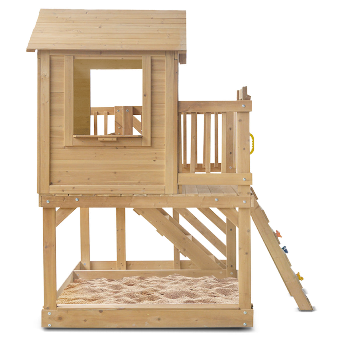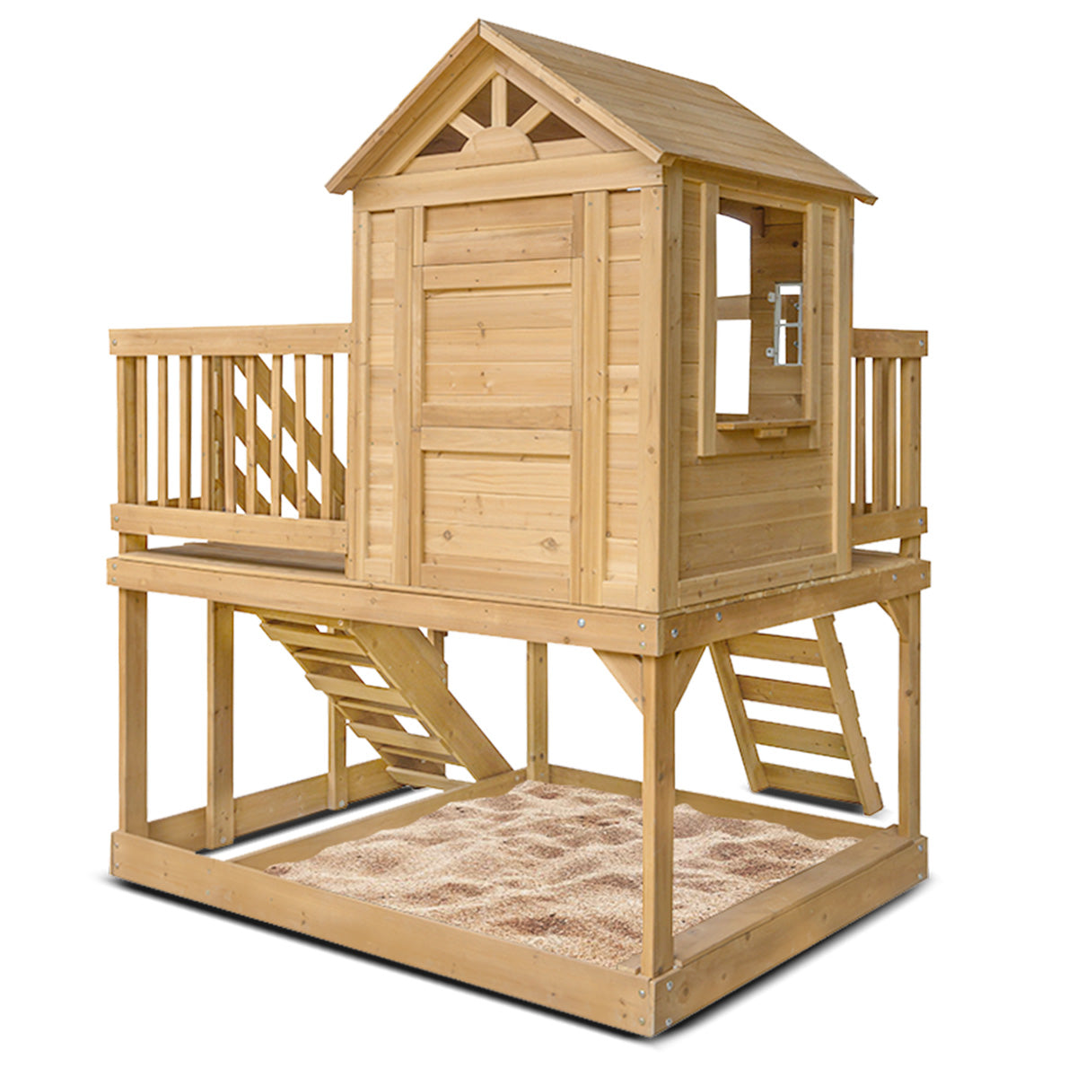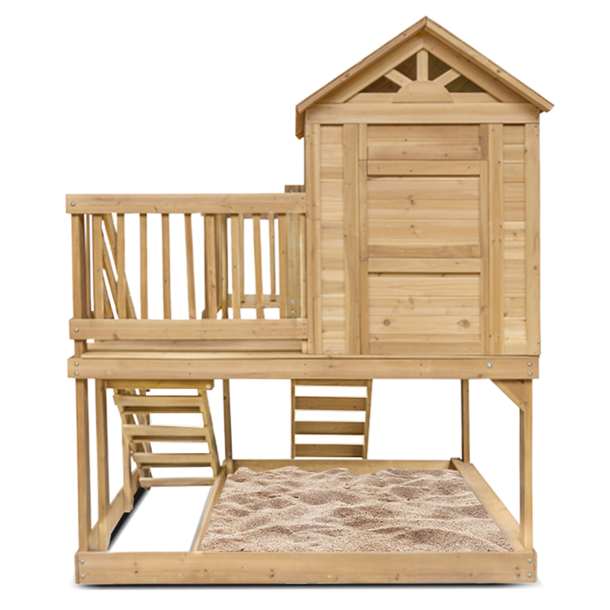 Raised playhouse with light, easy to use door and sunburst windows