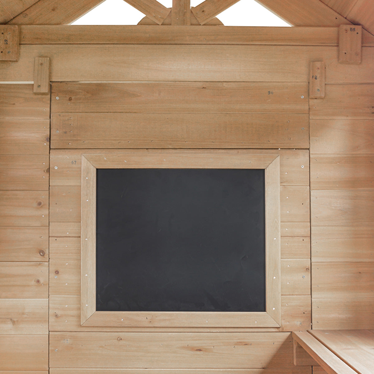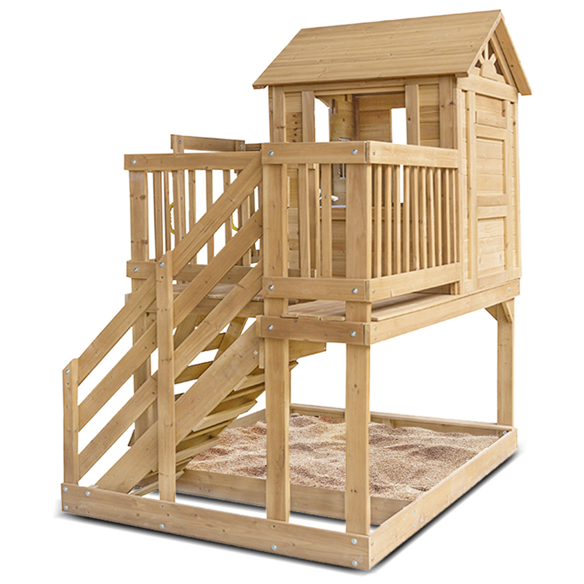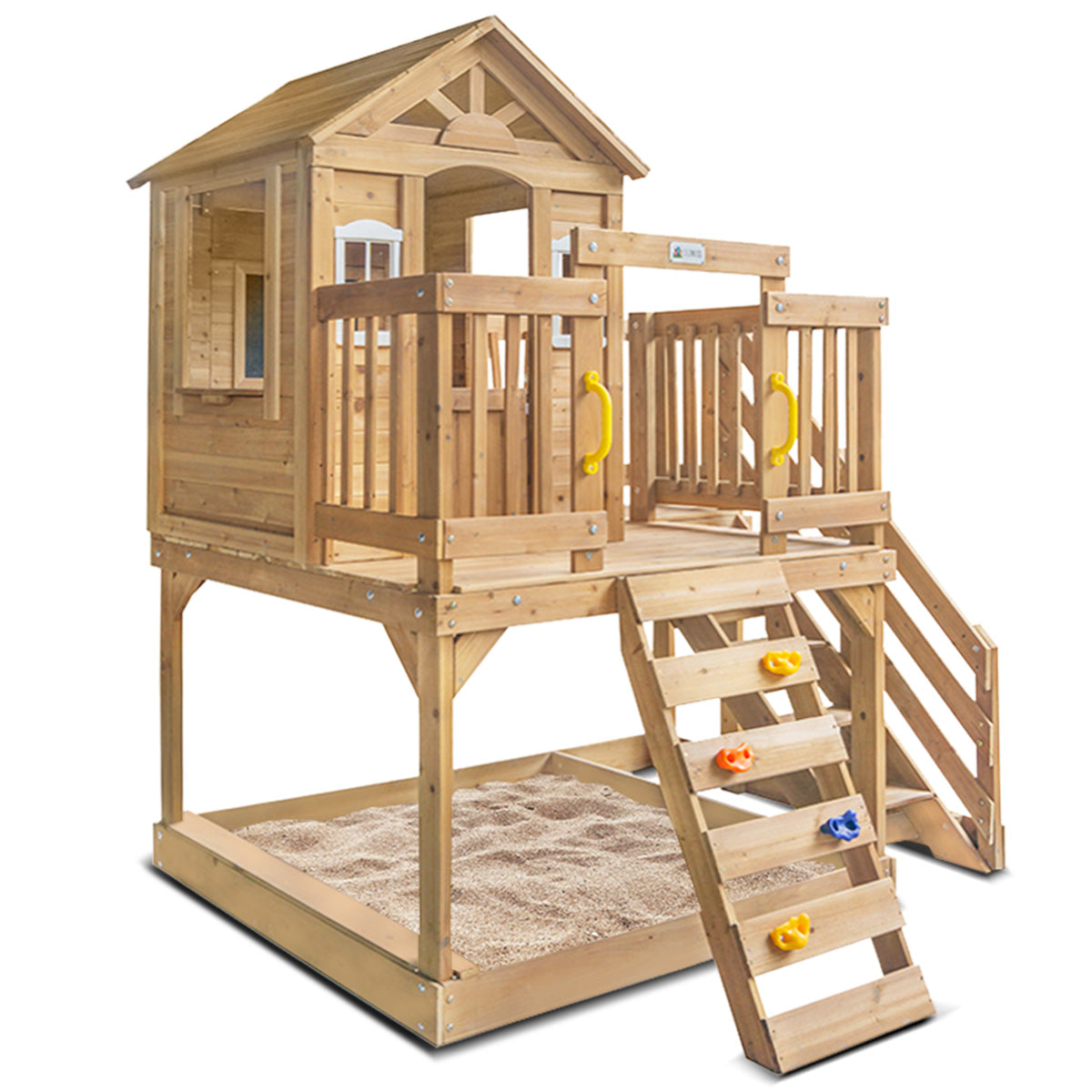 Raised playhouse with light, easy to use door and sunburst windows